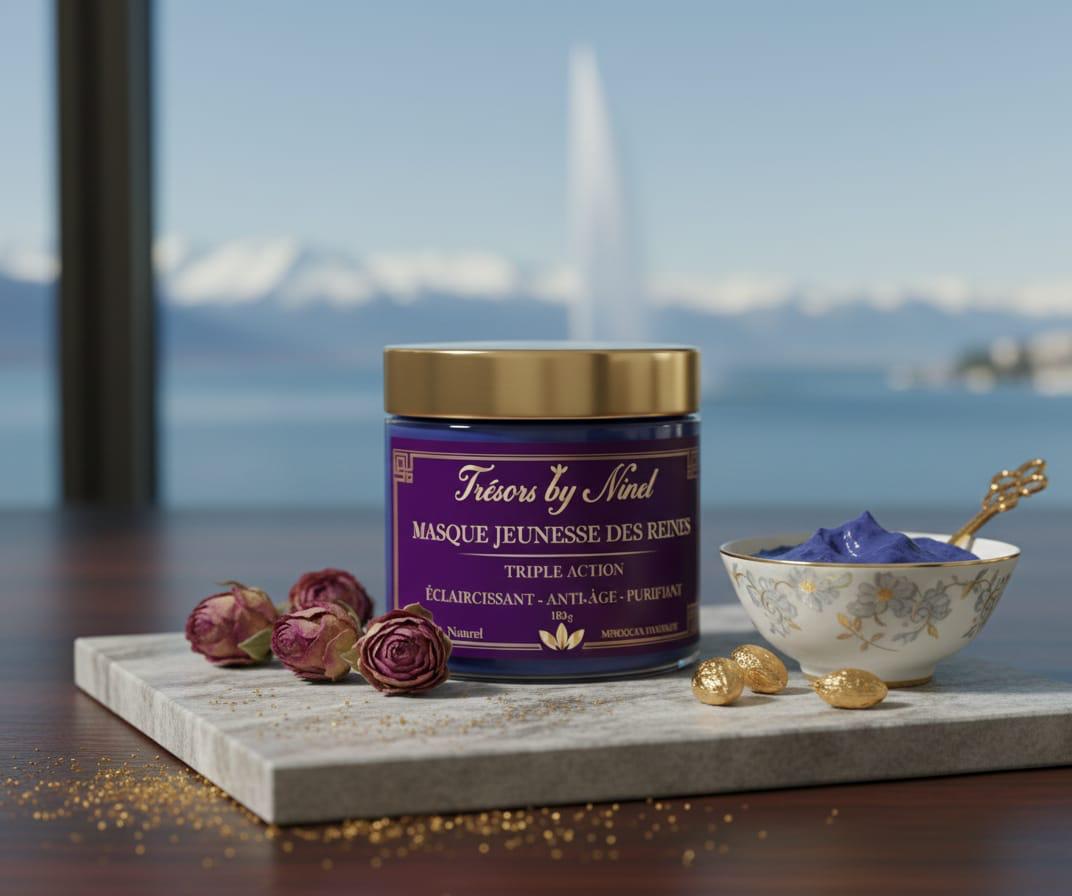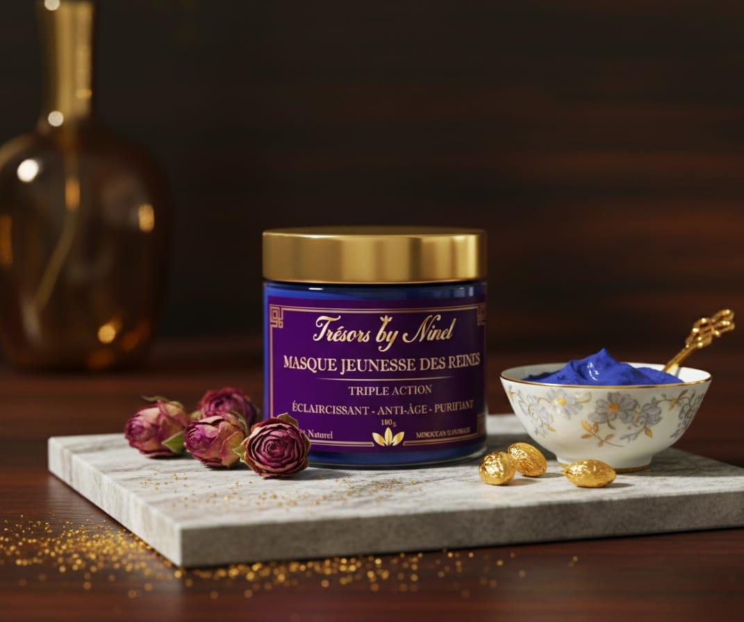 Le Masque Jeunesse des Reines est votre nouveau rituel 100% naturel. ✨ Son secret ? Le puissant mélange Nila, Réglisse et Fenugrec. Il éclaircit les taches, raffermit la peau et purifie en douceur. Une transformation royale, faite à la main au Maroc.
